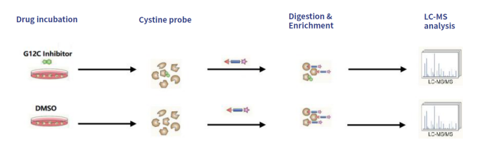 共价药物与细胞进行孵育后,会结合到靶蛋白上的某个半胱氨酸位点上,导致该位点与后续所加入的半胱氨酸反应性探针的反应程度下降。因此,通过后续的富集和质谱定量来分析该探针对半胱氨酸位点的修饰程度,即可以鉴定共价药物分子在体内所能结合的半胱氨酸位点,为药物的研发提供一定的数据支撑。‘
