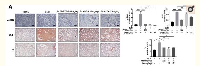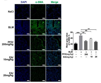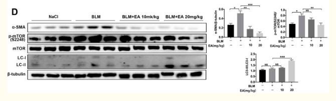 FIGURE 6 Ellagic acid attenuates BLM-induced fibroblasts activation and ECM accumulation in vivo. The mice were treated with Ellagic acid (10 mg/kg, 20 mg/kg) from day 7–13 after administrating BLM (A) Immunohistochemistry was used to analyze the expression levels of α-SMA, Col1 and Fn (n = 3). Quantitative analysis was shown beside. Scale bars: 50 μm (B–C) The expression levels of α-SMA and Col1 were detected by immunofluorescence in lung sections. The analyses of mean gray value were shown beside. Scale bars: 50 μm (D) Lung homogenization was used to analysis the α-SMA, LC3-II/I and p-mTOR , mTOR expression levels by Western blot (n = 6). Densitometric analyses were shown beside. Data in (A,D) are means ± Standard Error of Mean, *p < 0.05, **p < 0.01, ***p < 0.001, and NS: nonsignificant (one-way ANOVA). β-tubulin was used as a loading control....