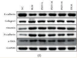 Figure 4 The expression levels of E-cadherin (a), collagen I (b), vimentin (c), N-cadherin (d), and a-SMA (e) protein and their protein band (f) in the lung tissue of mice in each group. NC, normal control group; BLM, bleomycin-induced systemic sclerosis model group; PESV-L, low-dose PESV intervention group; PESV-M, medium-dose PESV intervention group; PESV-H, high-dose PESV intervention group; DXM, dexamethasone intervention group....