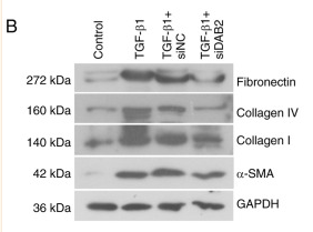 Figure 3 Knockdown of DAB2 inhibited fibrogenesis. (A) Immunofluorescence staining of α-SMA in MRC-5 cells with downregulation of DAB2 following by the treatment of TGF-β1 (scale bar, 50 µm). (B) Protein levels of collagen, collagen Ⅳ, fibronectin and α-SMA in the cells. Data were presented as mean ± SD with three biological repetitions in each group. **P...