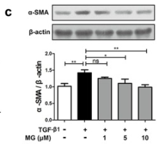 Fig. 1. . Regulation of natural compound mogrol on the EMT in TGF-β1 mediated alveolar epithelial cells MLE-12. Mouse MLE-12 cells were treated with or without TGF-β1 (10 ng/ml) in the absence or presence of mogrol for 48 h. (a) Chemical structure of mogrol. (b) Effects of mogrol (0.1–100 μM) on the proliferation MLE-12 cells were measured by MTT assays. (c-f) Protein expressions of α-SMA, Col I, Vimentin and E-cadherin in MLE-12 cells treated with/without TGF-β1 were detected by western blotting analysis. Data are presented as mean ± SD (n = 5). *p < 0.05, **p < 0.01, ***p < 0.001. NS, non-significant....