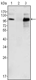 Figure 1: Western blot analysis using Androgen receptor mouse mAb against K562 (1), Jurkat (2) and LNCaP (3) cell lysate....