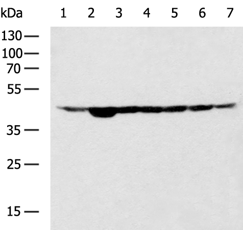 Gel: 8%SDS-PAGE, Lysate: 40 μg, Lane 1-7: Mouse kidney tissue, Mouse brain tissue, 231 cell, Hela cell, 293T cell, HepG2 cell, NIH/3T3 cell lysates, Primary antibody: D110001(ACTB Antibody) at dilution 1/800, Secondary antibody: ab100004(HRP-conjugated Goat anti rabbit IgG) at 1/5000 dilution, Exposure time: 5 seconds...