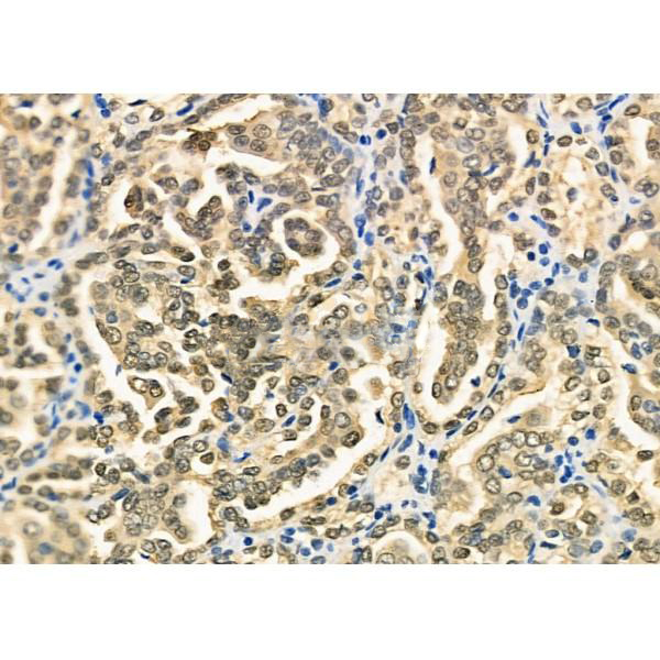 ab14351 at 1/100 staining Human kidney cancer by IHC-P. The sample was formaldehyde fixed and a heat mediated antigen retrieval step in citrate buffer was performed. The sample was then blocked and incubated with the primary antibody at 4°C overnight. An HRP conjugated anti-Rabbit antibody was used as the secondary antibody....