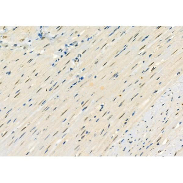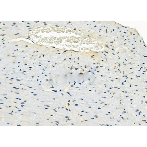 ab14351 at 1/100 staining Mouse heart tissue by IHC-P. The sample was formaldehyde fixed and a heat mediated antigen retrieval step in citrate buffer was performed. The sample was then blocked and incubated with the primary antibody at 4°C overnight. An HRP conjugated anti-Rabbit antibody was used as the secondary antibody....