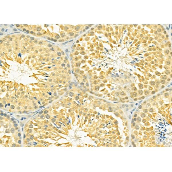 ab14351 at 1/100 staining Mouse testis tissue by IHC-P. The sample was formaldehyde fixed and a heat mediated antigen retrieval step in citrate buffer was performed. The sample was then blocked and incubated with the primary antibody at 4°C overnight. An HRP conjugated anti-Rabbit antibody was used as the secondary antibody....