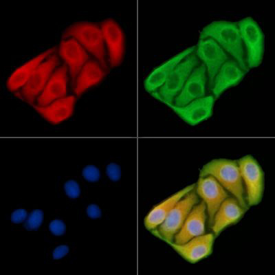 ab14351 staining Hela cells by IF/ICC. The samples were fixed with PFA and permeabilized in 0.1% Triton X-100, then blocked in 10% serum for 45 minutes at 25°C. Samples were then incubated with primary Ab(#ab14351) and mouse anti-beta tubulin Ab(#T0023) for 1 hour at 37°C. An AlexaFluor594 conjugated goat anti-rabbit IgG Ab(Red) and an AlexaFluor488 conjugated goat anti-mouse IgG Ab(Green) were used as the secondary antibody. The nuclear counter stain is DAPI (blue)....