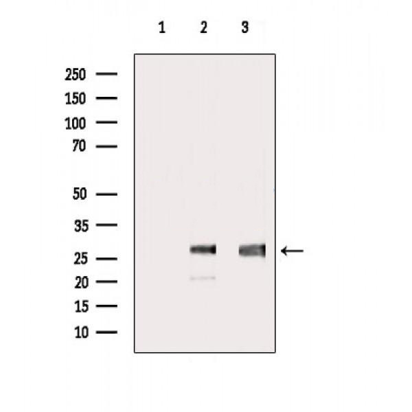 Western blot analysis of extracts from various samples, using 14-3-3 sigma Antibody. Lane 1: Rat brain, blocked with antigen-specific peptides, Lane 2: Rat brain, Lane 3: K562 cells....
