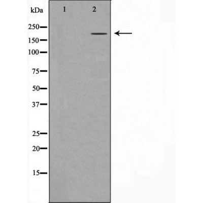 Western blot analysis of extracts from A431 , using TP53BP1 antibody. The lane on the left was treated with the antigen-specific peptide....