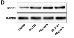 Fig. 5. Olaparib combined with ML216 has a better effect in enhancing total DNA damage. A–D IF staining showing the expression of γH2AX and 53BP1 in PC3 cells treated with ML216 (8 μM) and olaparib (50 μM), ML216 or olaparib monotherapy, or DMSO for 48 h. Scale bars: 25 μm. E Comet assay of PC3 cells treated with ML216 (8 μM) and olaparib (50 μM), ML216 or olaparib monotherapy, or DMSO for 48 h.The olive tail moment was used as an index and was statistically analyzed. Scale bars: 20 μm. F–G Western blot analysis of the expression of proteins involved in the HR and NHEJ pathways in PC3 cells treated with ML216 (8 μM) and olaparib (50 μM), ML216 or olaparib monotherapy, or DMSO for 48 h. Scale bars: 20 μm. Shown are the means ± SD from 3 experiments (*P ...