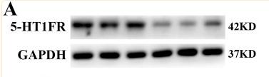 FIGURE 3 Expression of 5-HT1F receptor in the spinal cord of sham and neuropathic pain rats. (A) The protein level of 5-HT1F receptor was significantly decreased in SNI rats, beginning at day 3 after surgery and remain at low level until day 14 (** p < 0.01 compared with sham group, n = 6 in each group). (B) Histogram showing the mean intensity of 5-HT1F receptor immunofluorescent activity was significantly decreased in SNI rats, beginning at day 3 after surgery and remain at low level until day 14 (****p < 0.0001 compared with sham group, n = 6 in each group). (C–H) Representative photomicrographs showed that neuropathic pain induced the downregulation of 5-HT1F receptor in the spinal cord....