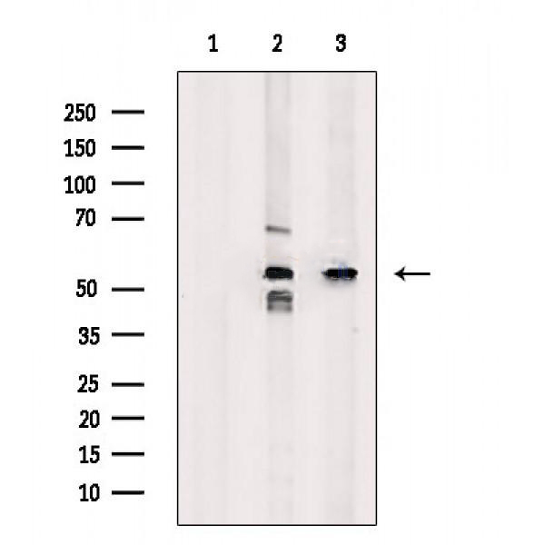 Western blot analysis of extracts from various samples, using 5HT3A receptor Antibody. Lane 1: A549 cells, blocked with antigen-specific peptides, Lane 2: A549 cells, Lane 3: Hela cells....