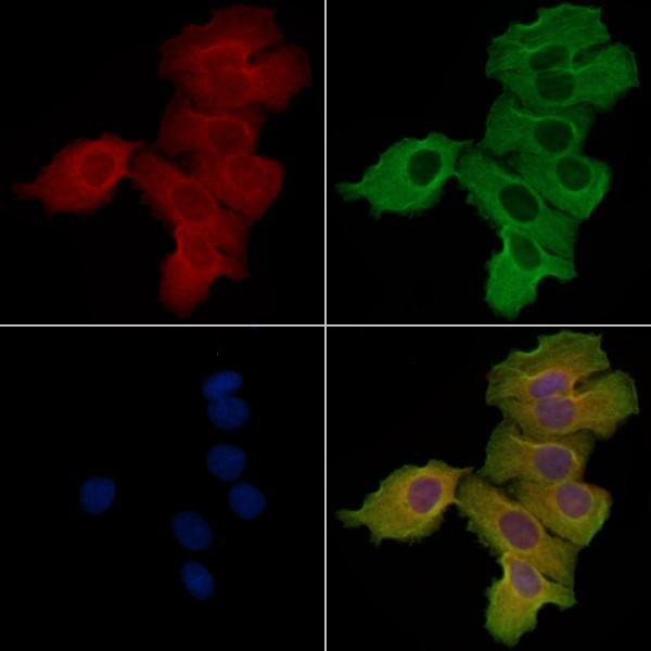 ab14363 staining Hela cells by IF/ICC. The samples were fixed with PFA and permeabilized in 0.1% Triton X-100,then blocked in 10% serum for 45 minutes at 25°C. Samples were then incubated with primary Ab(ab14363) and mouse anti-beta tubulin Ab(T0023) for 1 hour at 37°C. An AlexaFluor594 conjugated goat anti-rabbit IgG(H+L) Ab(Red) and an AlexaFluor488 conjugated goat anti-mouse IgG(H+L) Ab(Green) were used as the secondary antibody. The nuclear counter stain is DAPI (blue)....