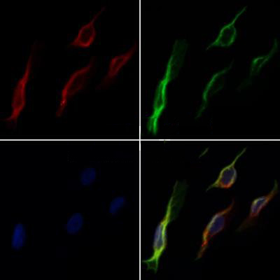 ab17198 staining Hela cells by IF/ICC. The samples were fixed with PFA and permeabilized in 0.1% Triton X-100,then blocked in 10% serum for 45 minutes at 25°C. Samples were then incubated with primary Ab(ab17198 1:200) and mouse anti-beta tubulin Ab(T0023 1:200) for 1 hour at 37°C. An AlexaFluor594 conjugated goat anti-rabbit IgG(H+L) Ab(Red) and an AlexaFluor488 conjugated goat anti-mouse IgG(H+L) Ab(Green) were used as the secondary antibody. The nuclear counter stain is DAPI(blue)....