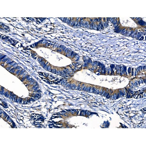 ab10970 at 1/100 staining Human colorectal cancer by IHC-P. The sample was formaldehyde fixed and a heat mediated antigen retrieval step in citrate buffer was performed. The sample was then blocked and incubated with the primary antibody at 4°C overnight. An HRP conjugated anti-Rabbit antibody was used as the secondary antibody....
