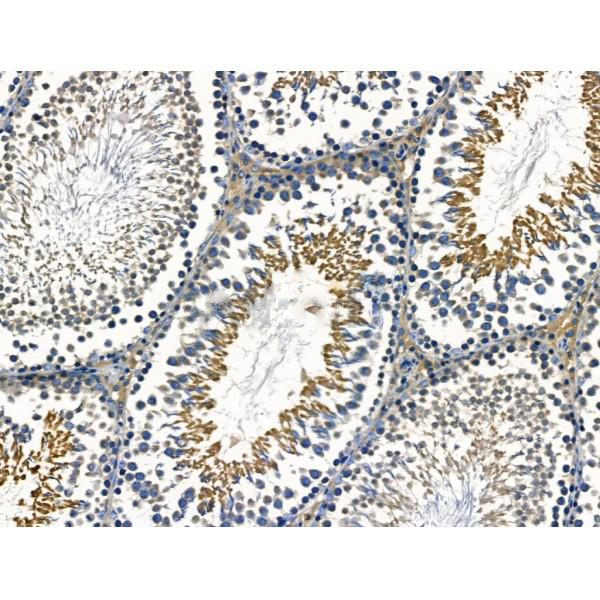 ab10970 at 1/100 staining Rat testis tissue by IHC-P. The sample was formaldehyde fixed and a heat mediated antigen retrieval step in citrate buffer was performed. The sample was then blocked and incubated with the primary antibody at 4°C overnight. An HRP conjugated anti-Rabbit antibody was used as the secondary antibody....