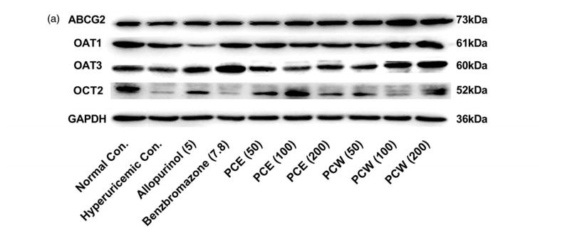 Figure 4. Effects of PCE and PCW on renal ABCG2, OAT3, OAT1 and OCT2 protein expression detected by Western blot: immunoreactive bands (a) and densitometries (b,c,d and –e, expressed as mean ± SD; n n ¼ 3). p < 0.05, p < 0.01 versus the normal control; #p < 0.05, ##p < 0.01 versus the hyperuricemic control; p < 0.01 versus the allopurinol control....