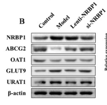 Fig. 2. Effect of NRBP1 overexpression and knockdown on the secretion and reabsorption of uric acid. A, Effect of NRBP1 overexpression and knockdown on the mRNA expression of NRBP1, ABCG2, OAT1, GLUT9 and URAT1. B, Effect of NRBP1 overexpression and knockdown on the protein expression of NRBP1, ABCG2, OAT1, GLUT9 and URAT1....