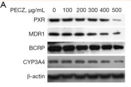 Figure 3 Effect of PECZ on the protein expression of drug resistance genes in MDA-MB-231/docetaxel cells. Representative band of each protein (A). Relative protein expression of PXR (B), MDR1 (C), BCRP (D), and CYP3A4 (E). (x¯±s, n=3), *, P<0.05; **, P<0.01 vs. control group. PECZ, petroleum ether extracts of Curcuma zedoaria; PXR, pregnane X receptor; MDR1, multidrug resistance 1; BCRP, breast cancer resistance protein; CYP3A4, cytochrome P-450....