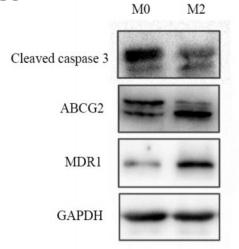 Figure 2. |Characterization of M0, M1 and M2 macrophages. M2 macrophages could promote the chemoresistance of ovarian cancer cells.(F) Western blotting was used to test the expression levels of cleaved caspase 3, ABCG2 and MDR1 in the ovarian cancer cells which co-cultured with M0 and M2 macrophages. U6 and GAPDH were used as the control. The columns showed as the mean ± SE of triplicate samples. *P < 0.05; **P < 0.01; ***P < 0.001....