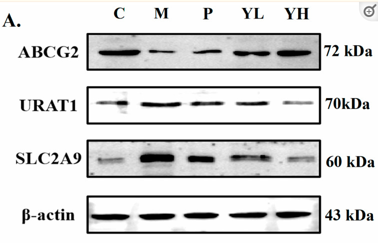Figure 6 Effect of CE on the expression (A) and relative expressions (B) of several key proteins related to uric acid transport in the kidney, including ABCG2, URAT1, and SLC2A9 (n = 6/group). The relative expression level was quantified to 1 as the ratio of the blank group to β-actin as a standard for comparison. Different letters on the same bar graph indicate significant differences (p < 0.05). C, control group; M, model group; P, positive group (5 mg/kg b.w. of allopurinol). YL, CE low dose group (400 mg/kg b.w. of CE) and YH, CE high dose group (800 mg/kg b.w. of CE)....