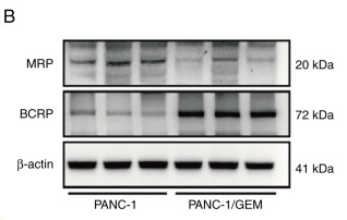 Figure 3. Assessment of MRP and BCRP expression in PANC-1 and PANC-1/GEM cells. (A) Reverse transcription-quantitative PCR analysis of MRP and BCRP mRNA expression levels in PANC-1 and PANC-1/GEM cells (n=3). (B) Western blot analysis of MRP and BCRP protein expression in PANC-1 and PANC-1/GEM cells (n=3). Data are presented as the mean ± SD. *P...