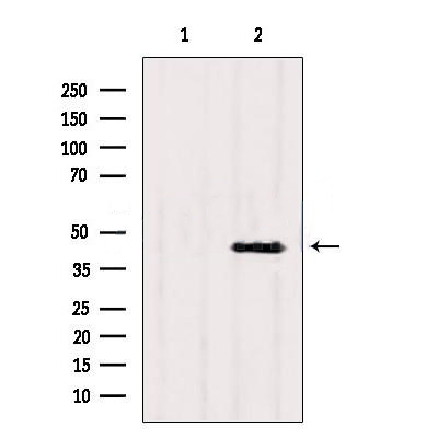Western blot analysis of extracts from rat heart, using ACADS antibody. Lane 1 was treated with the blocking peptide....