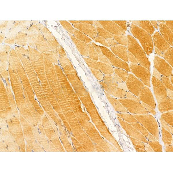 ab12806 at 1/100 staining Rat heart tissue by IHC-P. The sample was formaldehyde fixed and a heat mediated antigen retrieval step in citrate buffer was performed. The sample was then blocked and incubated with the primary antibody at 4°C overnight. An HRP conjugated anti-Rabbit antibody was used as the secondary antibody....