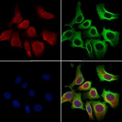 ab12865 staining Hela cells by IF/ICC. The samples were fixed with PFA and permeabilized in 0.1% Triton X-100,then blocked in 10% serum for 45 minutes at 25°C. Samples were then incubated with primary Ab(ab12865 1:200) and mouse anti-beta tubulin Ab(T0023 1:200) for 1 hour at 37°C. An AlexaFluor594 conjugated goat anti-rabbit IgG(H+L) Ab(Red) and an AlexaFluor488 conjugated goat anti-mouse IgG(H+L) Ab(Green) were used as the secondary antibody. The nuclear counter stain is DAPI(blue)....