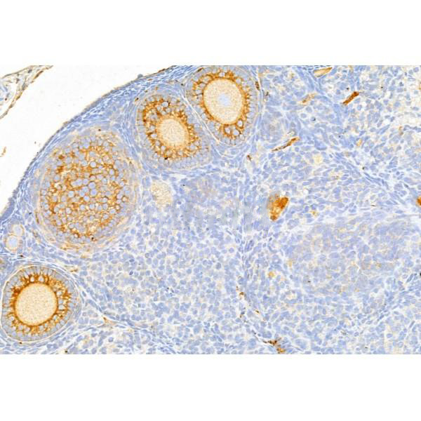 ab11596 at 1/100 staining Mouse ovary tissue by IHC-P. The sample was formaldehyde fixed and a heat mediated antigen retrieval step in citrate buffer was performed. The sample was then blocked and incubated with the primary antibody at 4°C overnight. An HRP conjugated anti-Rabbit antibody was used as the secondary antibody....