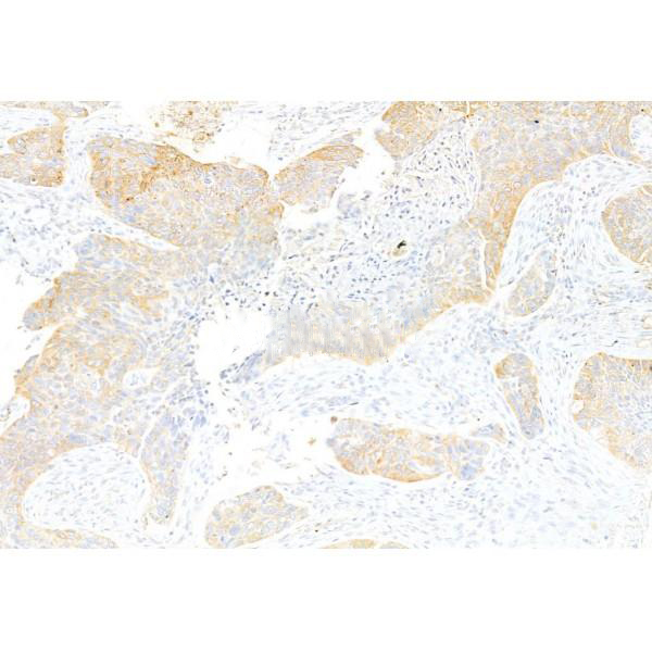 ab11596 at 1/100 staining Human lung cancer by IHC-P. The sample was formaldehyde fixed and a heat mediated antigen retrieval step in citrate buffer was performed. The sample was then blocked and incubated with the primary antibody at 4°C overnight. An HRP conjugated anti-Rabbit antibody was used as the secondary antibody....