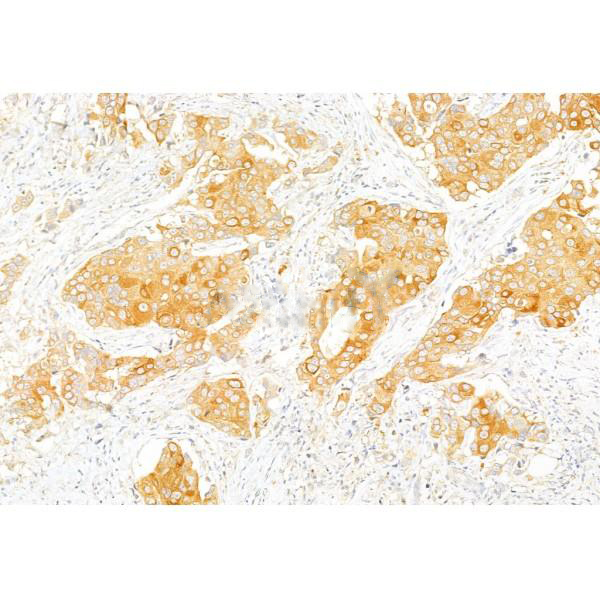 ab11596 at 1/100 staining Human mammary cancer by IHC-P. The sample was formaldehyde fixed and a heat mediated antigen retrieval step in citrate buffer was performed. The sample was then blocked and incubated with the primary antibody at 4°C overnight. An HRP conjugated anti-Rabbit antibody was used as the secondary antibody....
