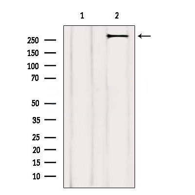 Western blot analysis of extracts from B16F10 cells, using ACC1 Antibody. The lane on the left was treated with blocking peptide....