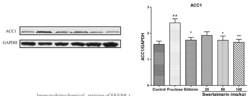 Figure.7. |Effect of swertiamarin (25, 50 and 100 mg/kg) and silibinin on (A) ACC1 expression by western blotting analysis. Immunohistochemical stainings of (B) SREBP-1 and (C) FAS in liver tissue of mice. Scale bar represents 30 μm. Representative analysis from six animals in each group.Significance is represented as ##P ≤ 0.01 and ###P ≤ 0.001 compared to the normal control group,*P ≤ 0.05 and **P ≤ 0.01 compared to the fructose group....