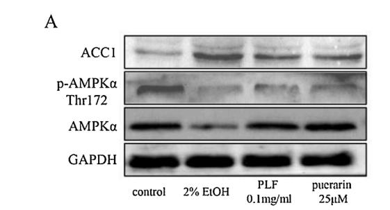 Fig. 8. The effect of PLF and puerarin on protein expression. (A) Protein expression level of AMPKα, p- AMPKα (Thr172) and ACC1. (B) Expression levels of pAMPKα/AMPKα. (C) Quantitation of western blotting analysis of ACC1. **P < 0.005 in comparison with the control group. ##P < 0.005 in comparison with the 2 % EtOH group....