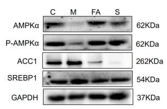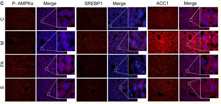 FIGURE 5 FA regulated the expression of lipid metabolites-related Proteins in HFD-fed ApoE−/− mice (A), (B) Protein expression of AMPKα, P-AMPKα, SREBP1, ACC1 in liver (n = 3), (C) inmmunofluorescence staining of ACC1, SREBP1 in Liver sections (200 ×). *p < 0.05; as compared to the control group. # p < 0.05, ## p < 0.01; as compared to the model group....