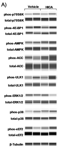 Figure 2 The effects of HICA on the intracellular signaling pathways. A typical image for a capillary immunoassay is shown (A). The phosphorylation levels of (B) p70S6K and 4E-BP1; (C) AMPK, ACC, and ULK1; (D) ERK1/2; (E) p38MAPK; and (F) eEF2 are shown. The phosphorylation is normalized to the total protein expression. The β-tubulin content in the lysate was measured as a loading control (G). The time course of these experiments is shown in the upper region. DM: differentiation medium, DMEM: Dulbecco’s modified Eagle’s medium, and w/o AA: without amino acids. Data are displayed as the means ± SD, and n = 4 for each group in all bar graphs. * p < 0.05 and ** p < 0.01 vs. the vehicle-treated group....