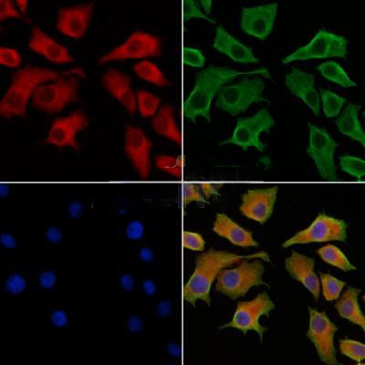 ab11596 staining HepG2 cells by IF/ICC. The samples were fixed with PFA and permeabilized in 0.1% Triton X-100,then blocked in 10% serum for 45 minutes at 25°C. Samples were then incubated with primary Ab(ab11596) and mouse anti-beta tubulin Ab(T0023) for 1 hour at 37°C. An AlexaFluor594 conjugated goat anti-rabbit IgG(H+L) Ab(Red) and an AlexaFluor488 conjugated goat anti-mouse IgG(H+L) Ab(Green) were used as the secondary antibody. The nuclear counter stain is DAPI(blue)....