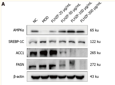 Figure 5. Fanlian Huazhuo Formula group regulated lipid synthesis signaling pathway in vitro. A: Protein expression levels of AMPKα, SREBP-1C, ACC1, FASN and β-actin in HepG2 cells induced by free fatty acid (n = 3); B: Relative mRNA expression levels of AMPKα, SREBP-1C, ACC1 and FASN in HepG2 cells tested by real-time quantitative polymerase chain reaction (n = 3). Data are presented as mean ± SE. aP < 0.05 vs NC group, cP < 0.05 vs MOD group. NC: Negative control group; MOD: Model group; FLHZF: Fanlian Huazhuo Formula group....