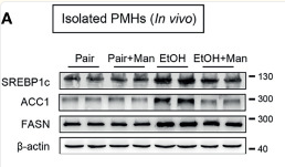 Figure 4. Mannose inhibits ethanol-induced hepatocyte lipogenesis. (A-C) Isolated PMHs were obtained from mice fed the control diet (Pair) or ethanol diet (EtOH) supplemented with or without 3% (w/v) mannose (Man). The protein (A) and mRNA (B) levels of SREBP1c, ACC1 and FASN were evaluated (n = 6). (C) Representative images of SREBP1c staining on the liver sections (n = 3). Scale bars = 100 μm. (D, E) PMHs from WT mice were stimulated by 200 mM ethanol (EtOH) with/without 5 mM mannose (Man) for 24 h, PMHs with cell culture medium as control (Ctrl). The protein (D) and mRNA (E) levels of lipogenic enzyme genes SREBP1c, ACC1, and FASN were evaluated (n = 3). Data are expressed as the means ± SEM of three independent experiments. *p < 0.05, **p < 0.01, ***p < 0.001, ****p < 0.0001, ns, not significant, unpaired two-tailed t-test....