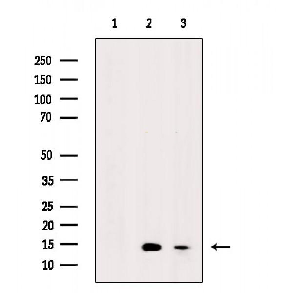 Western blot analysis of extracts from various samples, using Acetyl-Histone H2A (Lys9) Antibody. Lane 1: P19 cells(heat shock treatment), blocked with antigen-specific peptides, Lane 2: P19 cells(heat shock treatment), Lane 3: HepG2 cells(heat shock treatment)....