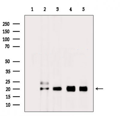 Western blot analysis of extracts from various samples, using Acetyl-Histone H2B (Lys20) Antibody. Lane 1: Pc12 cells(heat-shock treatment), blocked with antigen-specific peptides. Lane 2: Pc12 cells(heat-shock treatment). Lane 3: 3t3-l1 cells(heat-shock treatment). Lane 4: K562 cells(heat-shock treatment). Lane 5: Mcf7 cells(serum starvation treatment)....