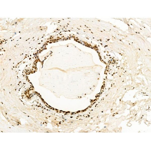 ab10672 at 1/100 staining Human mammary cancer by IHC-P. The sample was formaldehyde fixed and a heat mediated antigen retrieval step in citrate buffer was performed. The sample was then blocked and incubated with the primary antibody at 4°C overnight. An HRP conjugated anti-Rabbit antibody was used as the secondary antibody....