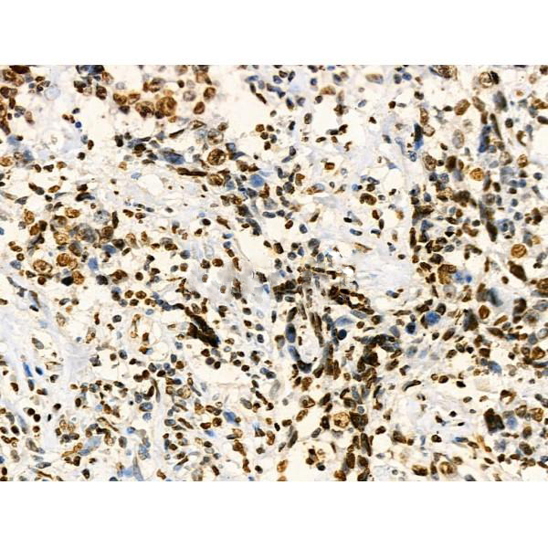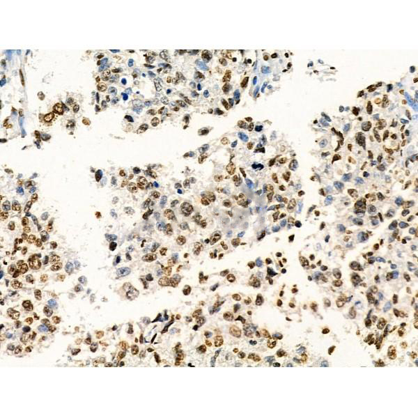 ab10672 at 1/100 staining Human lung cancer by IHC-P. The sample was formaldehyde fixed and a heat mediated antigen retrieval step in citrate buffer was performed. The sample was then blocked and incubated with the primary antibody at 4°C overnight. An HRP conjugated anti-Rabbit antibody was used as the secondary antibody....