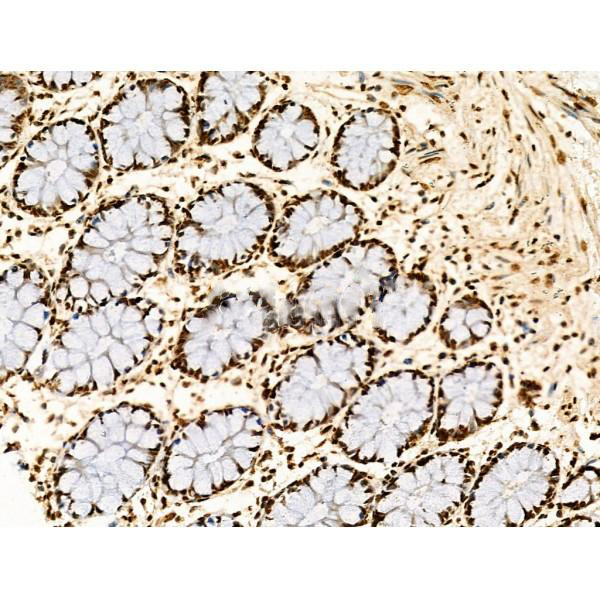 ab10672 at 1/100 staining Rat colorectal tissue by IHC-P. The sample was formaldehyde fixed and a heat mediated antigen retrieval step in citrate buffer was performed. The sample was then blocked and incubated with the primary antibody at 4°C overnight. An HRP conjugated anti-Rabbit antibody was used as the secondary antibody....