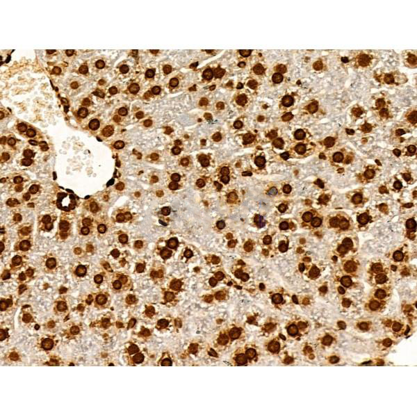 ab10672 at 1/100 staining Mouse liver tissue by IHC-P. The sample was formaldehyde fixed and a heat mediated antigen retrieval step in citrate buffer was performed. The sample was then blocked and incubated with the primary antibody at 4°C overnight. An HRP conjugated anti-Rabbit antibody was used as the secondary antibody....