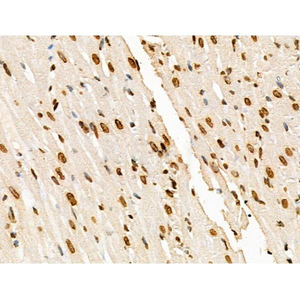 ab10672 at 1/100 staining Mouse heart tissue by IHC-P. The sample was formaldehyde fixed and a heat mediated antigen retrieval step in citrate buffer was performed. The sample was then blocked and incubated with the primary antibody at 4°C overnight. An HRP conjugated anti-Rabbit antibody was used as the secondary antibody....