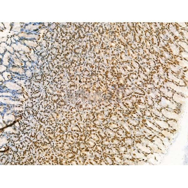 ab10672 at 1/100 staining Mouse stomach tissue by IHC-P. The sample was formaldehyde fixed and a heat mediated antigen retrieval step in citrate buffer was performed. The sample was then blocked and incubated with the primary antibody at 4°C overnight. An HRP conjugated anti-Rabbit antibody was used as the secondary antibody....