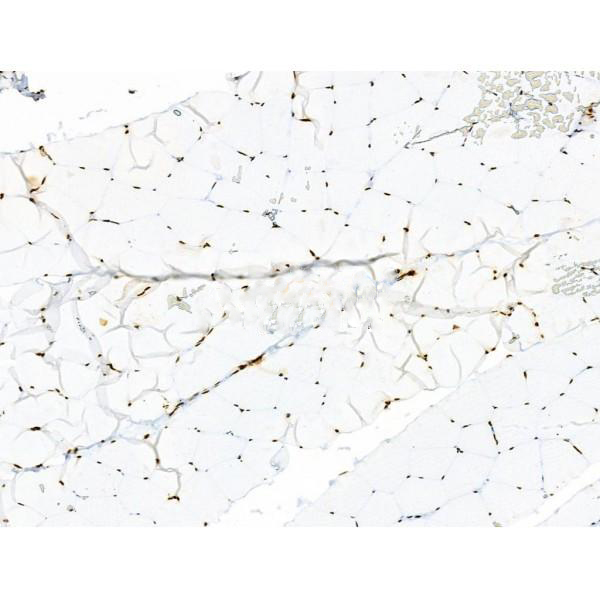 ab10672 at 1/100 staining Mouse muscle tissue by IHC-P. The sample was formaldehyde fixed and a heat mediated antigen retrieval step in citrate buffer was performed. The sample was then blocked and incubated with the primary antibody at 4°C overnight. An HRP conjugated anti-Rabbit antibody was used as the secondary antibody....