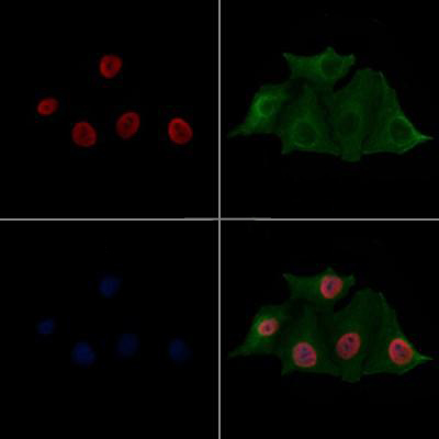 ab10672 staining HepG2 cells(30min of 4uM Forskolin treatment) by IF/ICC. The samples were fixed with PFA and permeabilized in 0.1% Triton X-100,then blocked in 10% serum for 45 minutes at 25°C. Samples were then incubated with primary Ab(ab10672) and mouse anti-beta tubulin Ab(T0023) for 1 hour at 37°C. An AlexaFluor594 conjugated goat anti-rabbit IgG(H+L) Ab(Red) and an AlexaFluor488 conjugated goat anti-mouse IgG(H+L) Ab(Green) were used as the secondary antibody. The nuclear counter stain is DAPI(blue)....